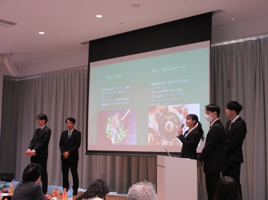 柴野ゼミ×株式会社グランディーユは、最近注目されつつあるウィーガンスイーツに着目した報告でした。