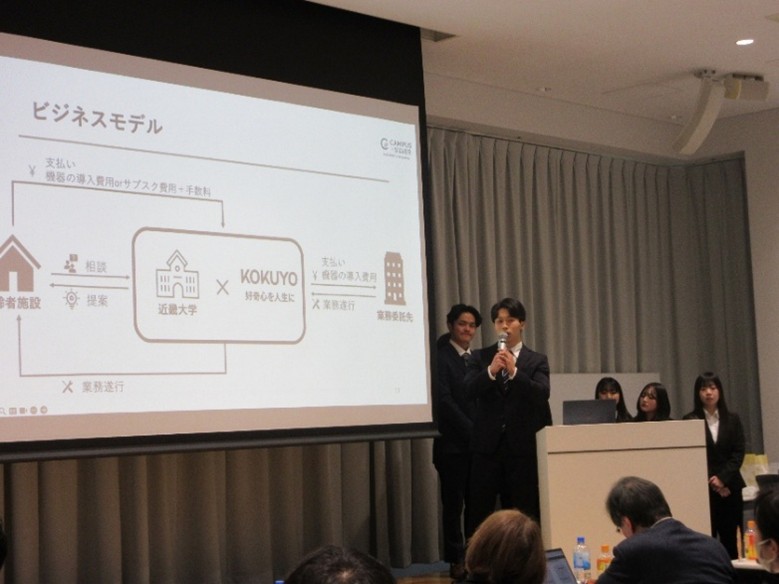 近畿大学金ゼミ×コクヨマーケティング株式会社は、近畿圏の7つの高齢者施設へのインタビューをもとに、コクヨブランドを活用した位置情報サービスと消耗品管理のシステム開発について報告してくれました。
