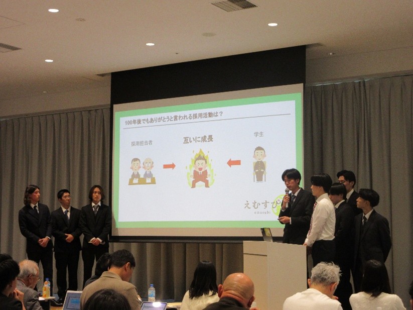 京都産業大学森口ゼミ×えむすび株式会社の協働による100年後から「ありがとう」と言われる採用という報告は、学生や企業へのインタビュー調査を繰り返しながら、採用する側の企業と就職活動をする学生がそれぞれ何を大切にして相手側に何を求めているのかを言語化しようとした報告でした。
