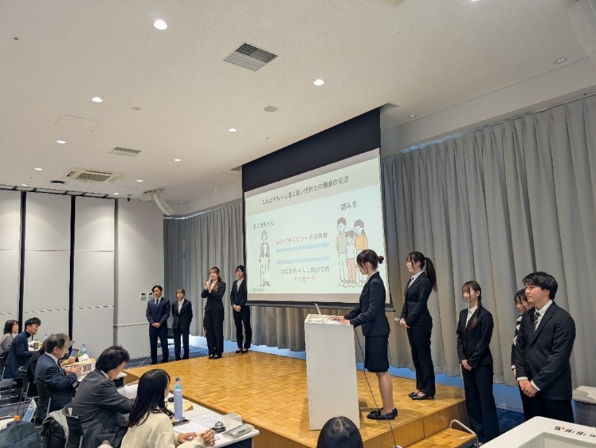横山ゼミチーム10人は、おばあちゃんの味を通して暖かな幸せの連鎖を生み出したいというパッションを実現するために、おばあちゃんの得意技ともいえる目分量での料理をユーチューブ動画で編集したり、おばあちゃんをモチーフにした動物が登場する絵本づくりにもチャレンジした活動を報告してくれました。